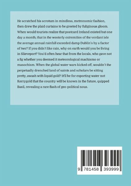 He scratched his scrotum in mindless, metronomic fashion, then drew the plaid curtains to be greeted by fuliginous gloom. When would tourists realize that postcard Ireland existed but one day a month; that in the westerly extremities of the verdant isle the average annual rainfall exceeded damp Dublin's by a factor of two? If you didn't like rain, why on earth would you be living in Slieveport? You'd often hear that from the locals, who gave not a fig whether you deemed it meteorological machismo or masochism. When the global water wars kicked off, wouldn't the perpetually drenched land of saints and scholars be sitting pretty, awash with liquid gold? It'll be for exporting water not Kerrygold that the country will be known in the future, quipped Basil, revealing a rare flash of geo-political nous.