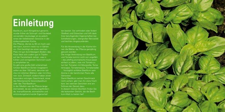 Basilikum, auch Königskraut genannt, wurde früher als Schnupf- und Kautabak verwendet; heutzutage ist es jedoch eines der beliebtesten Gewürze in der südeuropäischen Küche. Es gibt eine große Zahl unterschiedlichster Basilikum-Sorten (insgesamt sollen es über 150 sein), darunter solche mit rötlichen Blättern oder mit Zitronen- bzw. Zimtduft; andere haben einen besonders würzigen Geschmack, etwa das Mexikanische Gewürzbasilikum oder das Thai-Basilikum. In diesem kleinen Büchlein finden sich die leckersten Gerichte, die die Basilikum-Welt zu bieten hat!