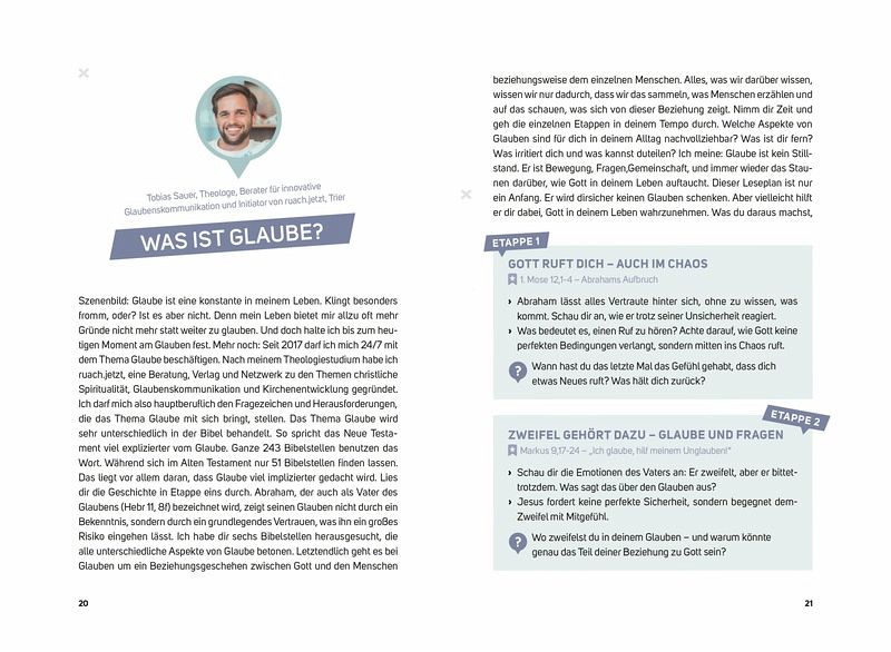 Jeder Bibelleseweg beginnt mit einer Einführung und bietet folgend fünf bis zehn Bibeltexte mit Vertiefungsimpulsen an. Eine Podcast-Serie eröffnet weitere Perspektiven.