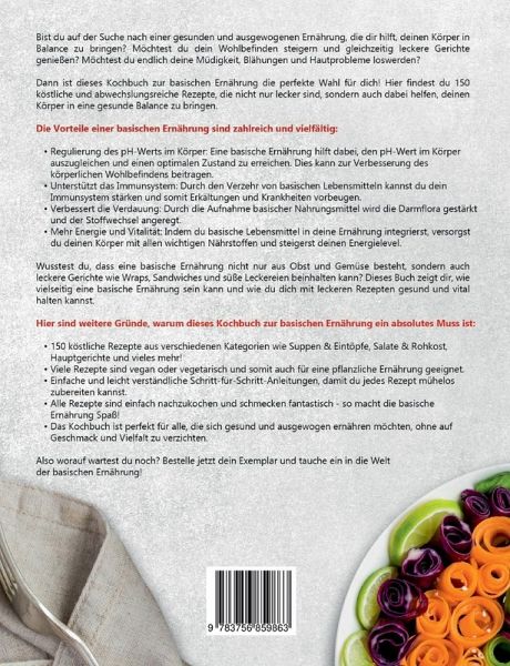 Bist du auf der Suche nach einer gesunden und ausgewogenen Ernährung, die dir hilft, deinen Körper in Balance zu bringen? Möchtest du dein Wohlbefinden steigern und gleichzeitig leckere Gerichte genießen? Möchtest du endlich deine Müdigkeit, Blähungen und Hautprobleme loswerden?Dann ist dieses Kochbuch zur basischen Ernährung die perfekte Wahl für dich! Hier findest du 150 köstliche und abwechslungsreiche Rezepte, die nicht nur lecker sind, sondern auch dabei helfen, deinen Körper in eine gesunde Balance zu bringen.Die Vorteile einer basischen Ernährung sind zahlreich und vielfältig:- Regulierung des pH-Werts im Körper: Eine basische Ernährung hilft dabei, den pH-Wert im Körper auszugleichen und einen optimalen Zustand zu erreichen. Dies kann zur Verbesserung des körperlichen Wohlbefindens beitragen.- Unterstützt das Immunsystem: Durch den Verzehr von basischen Lebensmitteln kannst du dein Immunsystem stärken und somit Erkältungen und Krankheiten vorbeugen.- Verbessert die Verdauung: Durch die Aufnahme basischer Nahrungsmittel wird die Darmflora gestärkt und der Stoffwechsel angeregt.- Mehr Energie und Vitalität: Indem du basische Lebensmittel in deine Ernährung integrierst, versorgst du deinen Körper mit allen wichtigen Nährstoffen und steigerst deinen Energielevel.Wusstest du, dass eine basische Ernährung nicht nur aus Obst und Gemüse besteht, sondern auch leckere Gerichte wie Wraps, Sandwiches und süße Leckereien beinhalten kann? Dieses Buch zeigt dir, wie vielseitig eine basische Ernährung sein kann und wie du dich mit leckeren Rezepten gesund und vital halten kannst.Hier sind weitere Gründe, warum dieses Kochbuch zur basischen Ernährung ein absolutes Muss ist:- 150 köstliche Rezepte aus verschiedenen Kategorien wie Suppen & Eintöpfe, Salate & Rohkost, Hauptgerichte und vieles mehr!- Viele Rezepte sind vegan oder vegetarisch und somit auch für eine pflanzliche Ernährung geeignet.- Einfache und leicht verständliche Schritt-für-Schritt-Anleitungen, damit du jedes Rezept mühelos zubereiten kannst.- Alle Rezepte sind einfach nachzukochen und schmecken fantastisch - so macht die basische Ernährung Spaß!- Das Kochbuch ist perfekt für alle, die sich gesund und ausgewogen ernähren möchten, ohne auf Geschmack und Vielfalt zu verzichten.Also worauf wartest du noch? Bestelle jetzt dein Exemplar und tauche ein in die Welt der basischen Ernährung!
