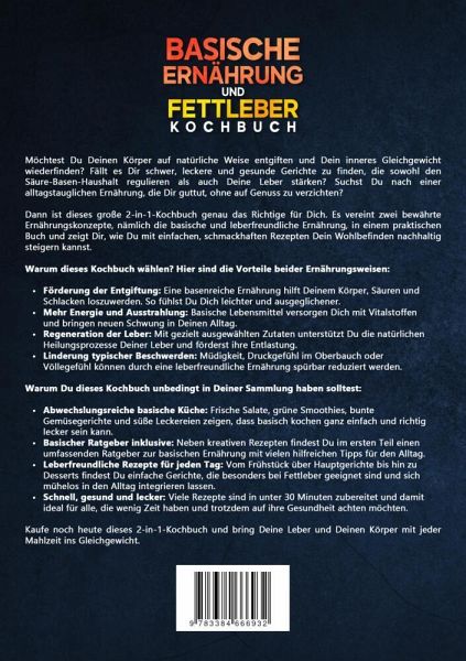 Möchtest Du Deinen Körper auf natürliche Weise entgiften und Dein inneres Gleichgewicht wiederfinden? Fällt es Dir schwer, leckere und gesunde Gerichte zu finden, die sowohl den Säure-Basen-Haushalt regulieren als auch Deine Leber stärken? Suchst Du nach einer alltagstauglichen Ernährung, die Dir guttut, ohne auf Genuss zu verzichten?Dann ist dieses große 2-in-1-Kochbuch genau das Richtige für Dich. Es vereint zwei bewährte Ernährungskonzepte, nämlich die basische und leberfreundliche Ernährung, in einem praktischen Buch und zeigt Dir, wie Du mit einfachen, schmackhaften Rezepten Dein Wohlbefinden nachhaltig steigern kannst.Warum dieses Kochbuch wählen? Hier sind die Vorteile beider Ernährungsweisen:- Förderung der Entgiftung: Eine basenreiche Ernährung hilft Deinem Körper, Säuren und Schlacken loszuwerden. So fühlst Du Dich leichter und ausgeglichener.- Mehr Energie und Ausstrahlung: Basische Lebensmittel versorgen Dich mit Vitalstoffen und bringen neuen Schwung in Deinen Alltag.- Regeneration der Leber: Mit gezielt ausgewählten Zutaten unterstützt Du die natürlichen Heilungsprozesse Deiner Leber und förderst ihre Entlastung.- Linderung typischer Beschwerden: Müdigkeit, Druckgefühl im Oberbauch oder Völlegefühl können durch eine leberfreundliche Ernährung spürbar reduziert werden.Warum Du dieses Kochbuch unbedingt in Deiner Sammlung haben solltest:- Abwechslungsreiche basische Küche: Frische Salate, grüne Smoothies, bunte Gemüsegerichte und süße Leckereien zeigen, dass basisch kochen ganz einfach und richtig lecker sein kann.- Basischer Ratgeber inklusive: Neben kreativen Rezepten findest Du im ersten Teil einen umfassenden Ratgeber zur basischen Ernährung mit vielen hilfreichen Tipps für den Alltag.- Leberfreundliche Rezepte für jeden Tag: Vom Frühstück über Hauptgerichte bis hin zu Desserts findest Du einfache Gerichte, die besonders bei Fettleber geeignet sind und sich mühelos in den Alltag integrieren lassen.- Schnell, gesund und lecker: Viele Rezepte sind in unter 30 Minuten zubereitet und damit ideal für alle, die wenig Zeit haben und trotzdem auf ihre Gesundheit achten möchten.Kaufe noch heute dieses 2-in-1-Kochbuch und bring Deine Leber und Deinen Körper mit jeder Mahlzeit ins Gleichgewicht.