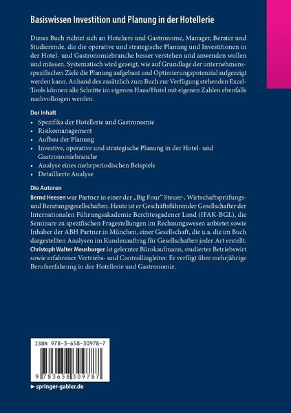 Dieses Buch richtet sich an Hoteliers und Gastronome, Manager, Berater und Studierende, die die operative und strategische Planung und Investitionen in der Hotel- und Gastronomiebranche besser verstehen und anwenden wollen und müssen. Systematisch wird gezeigt, wie auf Grundlage der unternehmensspezifischen Ziele die Planung aufgebaut und Optimierungspotenzial aufgezeigt werden kann. Anhand des zusätzlich zum Buch zur Verfügung stehenden Excel-Tools können alle Schritte im eigenen Haus/Hotel mit eigenen Zahlen ebenfalls nachvollzogen werden.