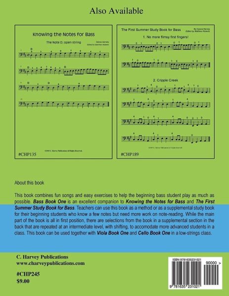 This book combines fun songs and easy exercises to help the beginning bass student play as much as possible. Bass Book One is an excellent companion to Knowing the Notes for Bass and The First Summer Study Book for Bass. Teachers can use this book as a method or as a supplemental study book for their beginning students who know a few notes but need more work on note-reading. While the main part of the book is all in first position, there are selections from the book in a supplemental section in the back that are repeated at an intermediate level, with shifting, to accomodate more advanced students in a class. This book can be used together with Viola Book One and Cello Book One in a low-strings class.