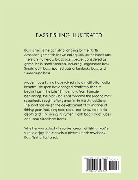 BASS FISHING ILLUSTRATED: Bass fishing is the activity of angling for the North American game fish known colloquially as the black bass. There are numerous black bass species considered as game fish in North America, including Largemouth bass, Smallmouth bass, Spotted bass or Kentucky bass, and Guadalupe bass. Modern bass fishing has evolved into a multi-billion dollar industry. The sport has changed drastically since its beginnings in the late 19th century. From humble beginnings, the black bass has become the second most specifically sought-after game fish in the United States. The sport has driven the development of all manner of fishing gear, including rods, reels, lines, lures, electronic depth and fish-finding instruments, drift boats, float tubes, and specialized bass boats. Whether you actually fish or just dream of fishing, you're sure to enjoy the marvelous pictures in this new book.