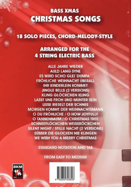 Christmas Songs for the electric bass18 Solo Tunes, Chord Melody StyleFrom easy to mediumArranged for the 4 string electric bassStandard notation and tabulatureWeihnachtslieder für den 4-saitigen E-Bass18 Solostücke mit Melodie und BegleitungNotiert in Standard Notation und TabulaturSchwierigkeitsgrad: Einfach bis MittelschwerIndex:Alle Jahre wieder, Auld lang syne, Es wird scho glei dumpa, Fröhliche Weihnacht überall, Ihr Kinderlein kommet, Jingle Bells (2 Versionen), Kling Glöckchen kling, Lasst uns froh und munter sein, Leise rieselt der Schnee, Morgen kommt der Weihnachtsmann, O du fröhliche / O, how joyfully, O Tannenbaum / O Christmas tree, Schneeflöckchen Weißröckchen, Stille Nacht / Silent Night (2 Versionen), Süßer die Glocken nie klingen, We wish you a merry Christmas