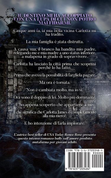 Il Destino mi ha accoppiato con una lupa di cui non potrò mai fidarmi. Cinque anni fa, la mia bella vicina Carlotta mi ha tradito. La mia famiglia è stata distrutta. A causa sua, il branco ha bandito mio padre, relegando me e mia madre a uno status inferiore, a malapena in grado di sopravvivere. Carlotta ha lasciato la città prima che scoprissi perché lo ha fatto. Prima che avessi la possibilità di fargliela pagare. Ma ora è tornata. Non è cambiata molto, ma io sì. Ora sono il doppio di lei. Molto più dominante. E ho appena scoperto che appartiene a me. Il che significa che Carlotta James è completamente alla mia mercé. E ho intenzione di farla implorare. L'autrice best seller di USA Today Renee Rose presenta questo intenso romanzo bully sull'amore proibito mutaforma per giovani adulti.