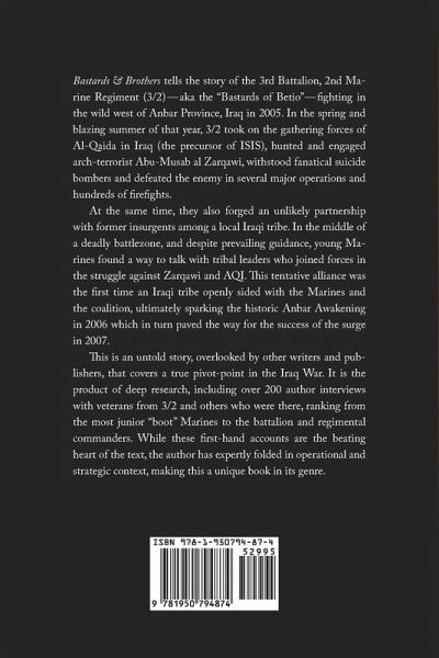 "This book should be required reading for NCO's, junior officers and senior leaders. Ajax describes in compelling detail tactical level actions and tough decisions that had strategic consequences."- H.R. McMaster, Lieutenant General (retired) and author of Battlegrounds "A detailed, finely-researched account not just of one battalion, but of the complex, grueling nature of the post-Saddam insurgency." - Bing West, bestselling author of No True Glory "Top notch history that is simultaneously hard to put down. A rare combination... Critical to understanding the Marine victory in Iraq's toughest province; Anbar..." - Owen West, award-winning author of The Snake Eaters Bastards & Brothers tells the story of the 3rd Battalion, 2nd Marine Regiment (3/2) -- aka the "Bastards of Betio"-- fighting in the wild west of Anbar Province, Iraq in 2005. In the spring and blazing summer of that year, 3/2 took on the gathering forces of Al-Qaida in Iraq (the precursor of ISIS), hunted and engaged arch-terrorist Abu-Musab al Zarqawi, withstood fanatical suicide bombers and defeated the enemy in several major operations and hundreds of firefights. At the same time, they also forged an unlikely partnership with former insurgents among a local Iraqi tribe. In the middle of a deadly battlezone, and despite prevailing guidance, young Marines found a way to talk with tribal leaders who joined forces in the struggle against Zarqawi and AQI. This tentative alliance was the first time an Iraqi tribe openly sided with the Marines and the coalition, ultimately sparking the historic Anbar Awakening in 2006 which in turn paved the way for the success of the surge in 2007. This is an untold story, overlooked by other writers and publishers, that covers a true pivot-point in the Iraq War. It is the product of deep research, including over 200 author interviews with veterans from 3/2 and others who were there, ranking from the most junior "boot" Marines to the battalion and regimental commanders. While these first-hand accounts are the beating heart of the text, the author has expertly folded in operational and strategic context, making this a unique book in its genre.