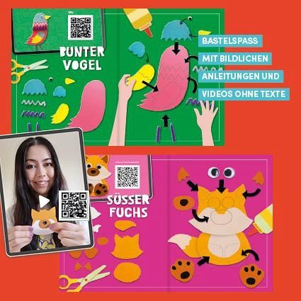 Bastelspaß mit Bildern, ohne TexteFördert Selbstständigkeit und Selbstwertgefühl der KinderBastelideen mit verschiedenen Materialien (z. B. Papier, Pappe, Eisstäbchen, Holzscheiben u.v.m.)Zu jeder Anleitung gibt es ein Video (QR-Code)