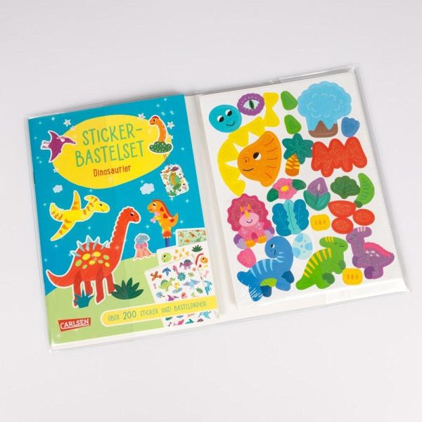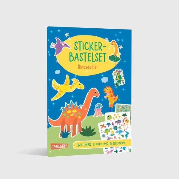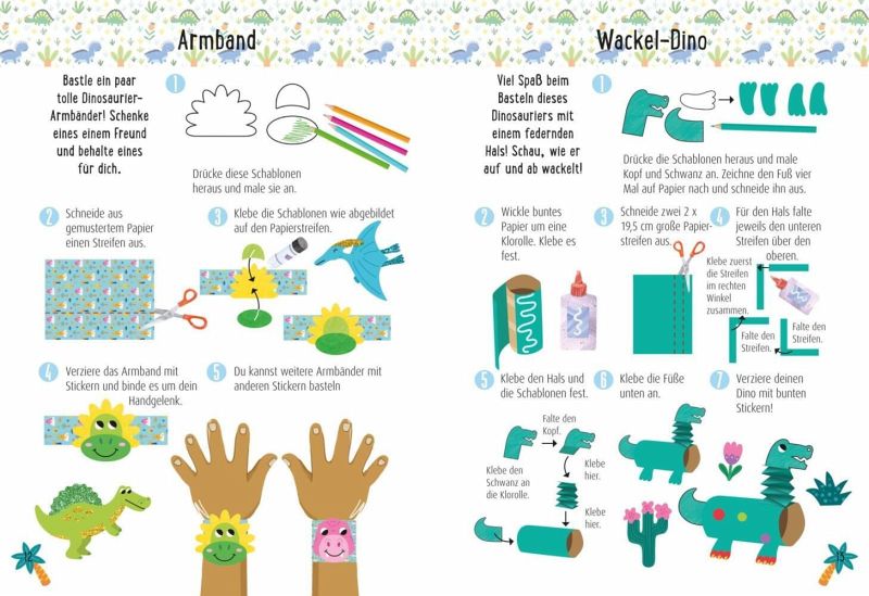 Bastelbuch mit vielen einfachen Schritt-für-Schritt-AnleitungenÜber 200 bunte und glitzernde Sticker mit Dino-Motiven