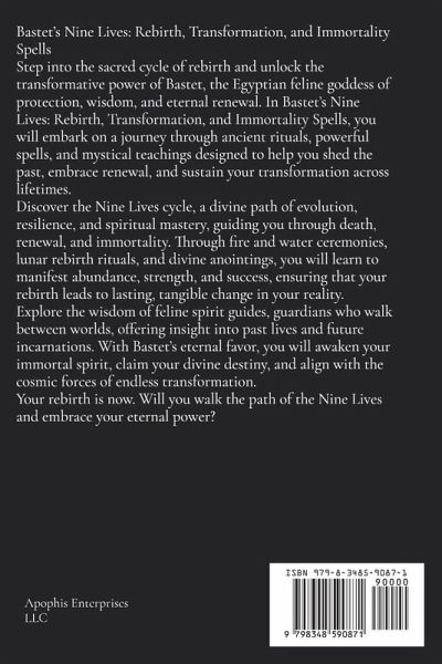 Bastet's Nine Lives: Rebirth, Transformation, and Immortality Spells Step into the sacred cycle of rebirth and unlock the transformative power of Bastet, the Egyptian feline goddess of protection, wisdom, and eternal renewal. In Bastet's Nine Lives: Rebirth, Transformation, and Immortality Spells, you will embark on a journey through ancient rituals, powerful spells, and mystical teachings designed to help you shed the past, embrace renewal, and sustain your transformation across lifetimes. Discover the Nine Lives cycle, a divine path of evolution, resilience, and spiritual mastery, guiding you through death, renewal, and immortality. Through fire and water ceremonies, lunar rebirth rituals, and divine anointings, you will learn to manifest abundance, strength, and success, ensuring that your rebirth leads to lasting, tangible change in your reality. Explore the wisdom of feline spirit guides, guardians who walk between worlds, offering insight into past lives and future incarnations. With Bastet's eternal favor, you will awaken your immortal spirit, claim your divine destiny, and align with the cosmic forces of endless transformation . Your rebirth is now. Will you walk the path of the Nine Lives and embrace your eternal power?