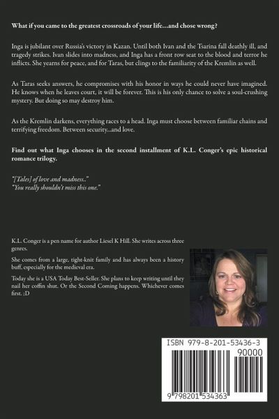 What if you came to the greatest crossroads of your life…and chose wrong? Inga is jubilant over Russia's victory in Kazan. Until both Ivan and the Tsarina fall deathly ill, and tragedy strikes. Ivan slides into madness, and Inga has a front row seat to the blood and terror he inflicts. She yearns for peace, and for Taras, but clings to the familiarity of the Kremlin as well. As Taras seeks answers, he compromises with his honor in ways he could never have imagined. He knows when he leaves court, it will be forever. This is his only chance to solve a soul-crushing mystery. But doing so may destroy him. As the Kremlin darkens, everything races to a head. Inga must choose between familiar chains and terrifying freedom. Between security...and love. Find out what Inga chooses in the second installment of K.L. Conger's epic historical romance trilogy. "[Tales] of love and madness.." "You really shouldn't miss this one."