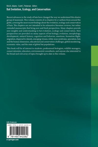 Recent advances in the study of bats have changed the way we understand this illusive group of mammals. This volume consist of 25 chapters and 57 authors from around the globe all writing on the most recent finding on the evolution, ecology and conservation of bats. The chapters in this book are not intended to be exhaustive literature reviews, but instead extended manuscripts that bring new and fresh perspectives. Many chapters consist of previously unpublished data and are repetitive of new insights and understanding in bat evolution, ecology and conservation. All chapters were peer-reviewed and revised by the authors. Many of the chapters are multi-authored to provide comprehensive and authoritative coverage of the topics.