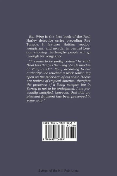 Bat Wing is the first book of the Paul Harley detective series preceding Fire Tongue. It features Haitian voodoo, vampirism, and murder in central London showing the lengths people will go through for vengeance. "It seems to be pretty certain" he said, "that this thing is the wing of a Desmodus or Vampire Bat. Now, according to our authority"--he touched a work which lay open on the other arm of his chair--"these are natives of tropical America, therefore the presence of a living vampire bat in Surrey is not to be anticipated. I am personally satisfied, however, that this unpleasant fragment has been preserved in some way."