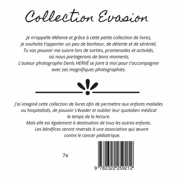 "Bateaux sur l'eau" de la collection Evasion, transporte l'enfant au bord de l'eau.Il va pouvoir se promener sur le port et observer les bateaux. Sentir le vent sur son visage. S'approcher d'un ponton et regarder les oiseaux. Un moment de détente au soleil. Ce petit livre est composé de textes et de magnifiques photographies qui permet à l'enfant de faire appel à ses sensations, ses souvenirs... Tous les bénéfices sont reversés à une association qui aide les enfants touchés par le cancer'ai imaginé cette collection de livres afin de permettre aux enfants malades ou hospitalisés, de pouvoir s'évader et oublier leur quotidien médical le temps de la lecture. Mais elle est également à destination de tous les autres enfants.