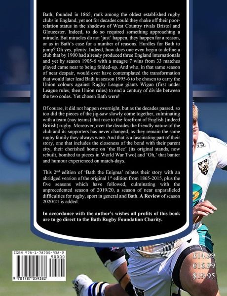 Bath, founded in 1865, rank among the oldest established rugby clubs in England, yet not for decades could they shake off their poor-relation status in the shadows of West Country rivals Bristol and Gloucester. Indeed, to do so required something approaching a miracle. But miracles do not 'just' happen, they happen for a reason, or as in Bath's case for a number of reasons. Hurdles for Bath to jump? Oh yes, plenty. Indeed, how does one even begin to define a club that by 1900 had already produced three England internationals and yet by season 1905-6 with a meagre 7 wins from 33 matches played came near to being folded-up. And who, in that same season of near despair, would ever have contemplated the transformation that would later lead Bath in season 1995-6 to be chosen to carry the Union colours against Rugby League giants Wigan (first under League rules, then Union rules) to end a century of divide between the two codes. Yet chosen Bath were! Of course, it did not happen overnight, but as the decades passed, so too did the pieces of the jigsaw slowly come together, culminating with a team (nay teams) that rose to the forefront of English (indeed British) rugby. Moreover, over the decades the friendly nature of the club and its supporters has never changed, as they remain the same rugby family they always were. And that is a fascinating part of their story, one that includes the closeness of the bond with their parent city, their cherished home on 'the Rec' (its original stands, now rebuilt, bombed to pieces in World War Two) and 'Oh,' that banter and humour experienced on match-days. This 2nd edition of 'Bath the Enigma' relates their story with an abridged version of the original 1st edition from 1865-2015, plus the five seasons which have followed, culminating with the unprecedented season of 2019/20, a season of near unparalleled difficulties for rugby, sport in general and Bath. A Review of season 2020/21 is added. In accordance with the author's wishes all royalties from this book go direct to the Bath Rugby Foundation Charity.