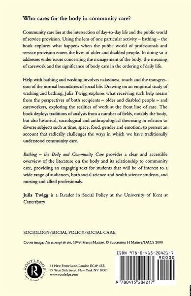 Community care lies at the intersection of day-to-day life and the public world of service provision. Using the lens of one particular activity - bathing - this book explores what happens when the public world of professionals and service provision enters the lives of older and disabled people. In doing so it addresses wider issues concerning the management of the body, the meaning of carework and the significance of body care in the ordering of daily life.