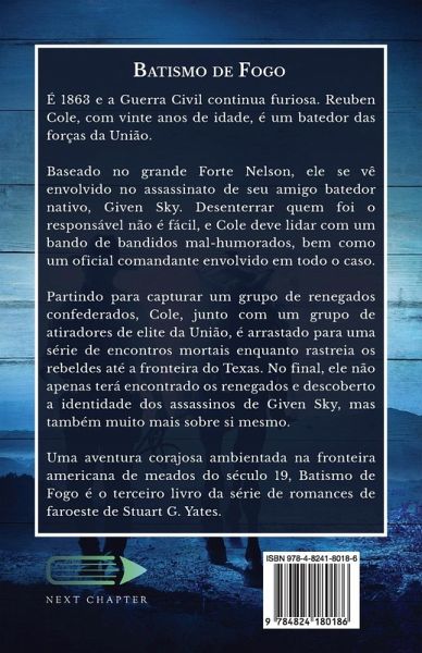 É 1863 e a Guerra Civil continua furiosa. Reuben Cole, com vinte anos de idade, é um batedor das forças da União. Baseado no grande Forte Nelson, ele se vê envolvido no assassinato de seu amigo batedor nativo, Given Sky. Desenterrar quem foi o responsável não é fácil, e Cole deve lidar com um bando de bandidos mal-humorados, bem como um oficial comandante envolvido em todo o caso. Partindo para capturar um grupo de renegados confederados, Cole, junto com um grupo de atiradores de elite da União, é arrastado para uma série de encontros mortais enquanto rastreia os rebeldes até a fronteira do Texas. No final, ele não apenas terá encontrado os renegados e descoberto a identidade dos assassinos de Given Sky, mas também muito mais sobre si mesmo. Uma aventura corajosa ambientada na fronteira americana de meados do século 19, Batismo de Fogo é o terceiro livro da série de romances de faroeste de Stuart G. Yates.