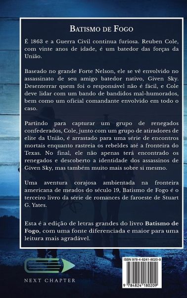 É 1863 e a Guerra Civil continua furiosa. Reuben Cole, com vinte anos de idade, é um batedor das forças da União. Baseado no grande Forte Nelson, ele se vê envolvido no assassinato de seu amigo batedor nativo, Given Sky. Desenterrar quem foi o responsável não é fácil, e Cole deve lidar com um bando de bandidos mal-humorados, bem como um oficial comandante envolvido em todo o caso. Partindo para capturar um grupo de renegados confederados, Cole, junto com um grupo de atiradores de elite da União, é arrastado para uma série de encontros mortais enquanto rastreia os rebeldes até a fronteira do Texas. No final, ele não apenas terá encontrado os renegados e descoberto a identidade dos assassinos de Given Sky, mas também muito mais sobre si mesmo. Uma aventura corajosa ambientada na fronteira americana de meados do século 19, Batismo de Fogo é o terceiro livro da série de romances de faroeste de Stuart G. Yates. Esta é a edição de letras grandes do livro Batismo de Fogo, com uma fonte diferenciada e maior para uma leitura mais agradável.