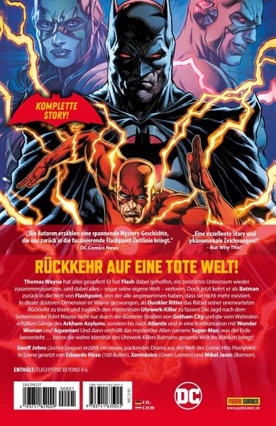 RÜCKKEHR AUF EINE TOTE WELT!Thomas Wayne hat alles geopfert! Er hat Flash dabei geholfen, ein zerstörtes Universum wieder zusammenzusetzen und dabei alles - sogar seine eigene Welt - verloren. Doch jetzt kehrt er als Batman zurück in die Welt von Flashpoint, von der alle angenommen haben, dass sie nicht mehr existiert. In dieser düsteren Dimension ist Wayne gezwungen, als Dunkler Ritter das Rätsel seiner unerwarteten Rückkehr zu lösen und zugleich den mysteriösen Uhrwerk-Killer zu fassen! Die Jagd nach dem Serienmörder führt Wayne nicht nur durch die düsteren Straßen von Gotham City und die vom Wahnsinn erfüllten Gänge des Arkham Asylums, sondern bis nach Atlantis und in eine Konfrontation mit Wonder Woman und Aquaman! Und dann enthüllt das mysteriöse Alien namens Super-Man, was der Erde bevorsteht ... bevor die wahre Identität des Uhrwerk-Killers Batmans gesamte Welt ins Wanken bringt! Geoff Johns (Justice League) erzählt ein neues, packendes Drama aus der Welt des Comic-Hits Flashpoint, in Szene gesetzt von Eduardo Risso (100 Bullets), Xermánico (Green Lantern) und Mikel Janín (Batman). ENTHÄLT: Flashpoint Beyond 0-6
