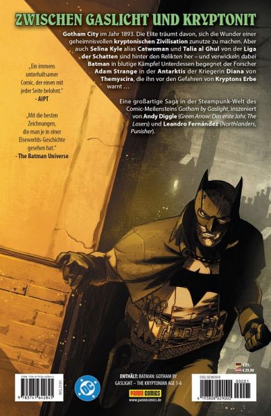 ZWISCHEN GASLICHT UND KRYPTONIT Gotham City im Jahr 1893. Die Elite träumt davon, sich die Wunder einer geheimnisvollen kryptonischen Zivilisation zunutze zu machen. Aber auch Selina Kyle alias Catwoman und Talia al Ghul von der Liga der Schatten sind hinter den Relikten her - und verwickeln dabei Batman in blutige Kämpfe! Unterdessen begegnet der Forscher Adam Strange in der Antarktis der Kriegerin Diana von Themyscira, die ihn vor den Gefahren von Kryptons Erbe warnt ... Eine großartige Saga in der Steampunk-Welt des Comic-Meilensteins Gotham by Gaslight, inszeniert von Andy Diggle (Green Arrow: Das erste Jahr, The Losers) und Leandro Fernández (Northlanders, Punisher).ENTHÄLT: BATMAN: GOTHAM BY GASLIGHT - THE KRYPTONIAN AGE 1-6
