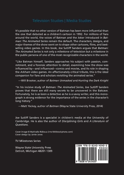 It's possible that no other version of Batman has been more influential than the one that debuted as a children's cartoon in 1992. For millions of fans around the world, the voices of Batman and the Joker introduced in Batman: The Animated Series (BTAS) remain the default. The characters, designs, and major themes of the show went on to shape other cartoons, films, and bestselling video games. In this study, Joe Sutliff Sanders argues that BTAS is not only a milestone of television but a milestone in the public persona of one of the most recognizable characters in the world. The series introduced a new generation to Batman and provided the foundation for a family of cartoons that expanded the superhero universe. It introduced or reinvented major characters including Mr. Freeze, Robin, the Joker, and Harley Quinn. In three chapters, Sanders pursues the intricate arguments that still energize BTAS. Chapter 1 explores the visuals of the show, the artistic histories and tensions that inform its revolutionary style, and what ideas-intentional and otherwise-its aesthetic implies. Chapter 2 turns to the task of defining a "good" wealthy person against a backdrop of "bad," getting to the heart of one of Batman's most problematic characteristics. Lastly, chapter 3 considers Harley Quinn, a character who emblemizes much of what made BTAS successful. From her first appearance, Harley has been both sexy and witty, victor and victim, and this chapter explains the duality that defines her. Since its debut in 1992, BTAS has garnered multiple awards, launched or developed the careers of countless important artists, and created aesthetic styles-in terms of both visuals and voice acting-that continue to resonate. Sanders's book follows an informative and exciting path through the material and is designed to be accessible to aficionados as well as relative newcomers. Batman fans, popular culture enthusiasts, and media studies scholars will find within these pages insights and ironies to provoke endless conversations.