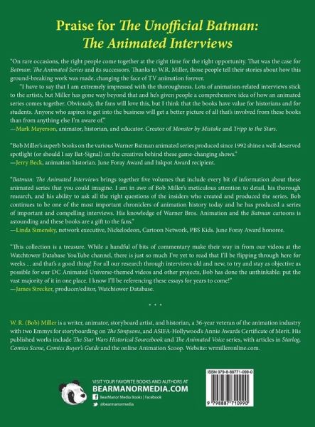 "On rare occasions, the right people come together at the right time for the right opportunity. That was the case for Batman: The Animated Series and its successors. Thanks to W.R. Miller, those people tell their stories about how this ground-breaking work was made, changing the face of TV animation forever. "I have to say that I am extremely impressed with the thoroughness. Lots of animation-related interviews stick to the artists, but Miller has gone way beyond that and he's given people a comprehensive idea of how an animated series comes together. Obviously, the fans will love this, but I think that the books have value for historians and for students. Anyone who aspires to get into the business will get a better picture of all that's involved from these books than from anything else I'm aware of." -Mark Mayerson, animator, historian, and educator. Creator of Monster by Mistake and Tripp to the Stars. "Bob Miller's superb books on the various Warner Batman animated series produced since 1992 shine a well-deserved spotlight (or should I say Bat-Signal) on the creatives behind these game-changing shows." -Jerry Beck, animation historian. June Foray Award and Inkpot Award recipient. "Batman: The Animated Interviews brings together five volumes that include every bit of information about these animated series that you could imagine. I am in awe of Bob Miller's meticulous attention to detail, his thorough research, and his ability to ask all the right questions of the insiders who created and produced the series. Bob continues to be one of the most important chroniclers of animation history today and he has produced a series of important and compelling interviews. His knowledge of Warner Bros. Animation and the Batman cartoons is astounding and these books are a gift to the fans." -Linda Simensky, network executive, Nickelodeon, Cartoon Network, PBS Kids. June Foray Award honoree. "This collection is a treasure. While a handful of bits of commentary make their way in from our videos at the Watchtower Database YouTube channel, there is just so much I've yet to read that I'll be flipping through here for weeks ... and that's a good thing! For all our research through interviews old and new, to try and stay as objective as possible for our DC Animated Universe-themed videos and other projects, Bob has done the unthinkable: put the vast majority of it in one place. I know I'll be referencing these essays for years to come!" -James Strecker, producer/editor, Watchtower Database. * * * W. R. (Bob) Miller is a writer, animator, storyboard artist, and historian, a 36-year veteran of the animation industry with two Emmys for storyboarding on The Simpsons, and ASIFA-Hollywood's Annie Awards Certificate of Merit. His published works include The Star Wars Historical Sourcebook and The Animated Voice series, with articles in Starlog, Comics Scene, Comics Buyer's Guide and the online Animation Scoop. Website: wrmilleronline.com.