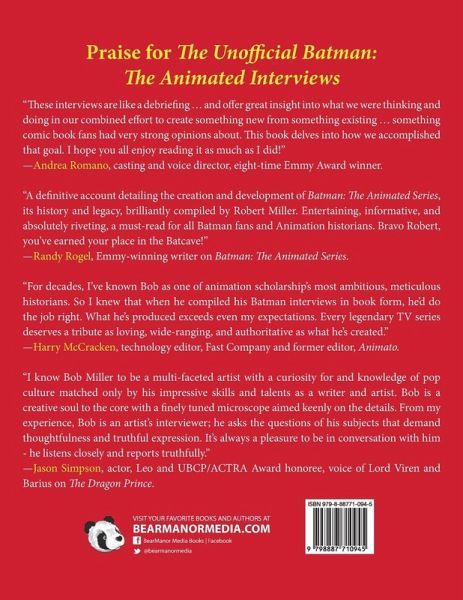 Praise for The Unofficial Batman: The Animated Interviews "These interviews are like a debriefing ... and offer great insight into what we were thinking and doing in our combined effort to create something new from something existing ... something comic book fans had very strong opinions about. This book delves into how we accomplished that goal. I hope you all enjoy reading it as much as I did!"-Andrea Romano, casting and voice director, eight-time Emmy Award winner. "A definitive account detailing the creation and development of Batman: The Animated Series, its history and legacy, brilliantly compiled by Robert Miller. Entertaining, informative, and absolutely riveting, a must-read for all Batman fans and Animation historians. Bravo Robert, you've earned your place in the Batcave!"-Randy Rogel, Emmy-winning writer on Batman: The Animated Series. "For decades, I've known Bob as one of animation scholarship's most ambitious, meticulous historians. So I knew that when he compiled his Batman interviews in book form, he'd do the job right. What he's produced exceeds even my expectations. Every legendary TV series deserves a tribute as loving, wide-ranging, and authoritative as what he's created."-Harry McCracken, technology editor, Fast Company and former editor, Animato. "I know Bob Miller to be a multi-faceted artist with a curiosity for and knowledge of pop culture matched only by his impressive skills and talents as a writer and artist. Bob is a creative soul to the core with a finely tuned microscope aimed keenly on the details. From my experience, Bob is an artist's interviewer; he asks the questions of his subjects that demand thoughtfulness and truthful expression. It's always a pleasure to be in conversation with him - he listens closely and reports truthfully."-Jason Simpson, actor, Leo and UBCP/ACTRA Award honoree, voice of Lord Viren and Barius on The Dragon Prince.