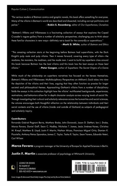 Introduction. Not Exactly a Cowardly Lot: Gotham's Villains Marco Favaro and Justin F. Martin Chapter 1. Death, Monk, and Strange: The Predecessors to the Supervillain in Detective Comics John Darowski Part I. Arkham City: The Asylum, the City and the Ones Who Rule Them Chapter 2. "This Place Isn't a Prison": Institutions, Choice, and the Case of Arkham Asylum Tony Spanakos and Damien K. Picariello Chapter 3. "You Can't Fight City Hall!": The Villains Hidden in Gotham's Government Ian J. Drake and Matthew B. Lloyd Chapter 4. The Owls Nesting in the Bat's City: Secrecy, Gotham's Social Structures, and the Court of Owls James C. Taylor Part II. Confronting Batman: Outsiders, Doppelgängers and Parodies Chapter 5. The Mutants, the Sons of Batman, and the Long Shadow of the Bat Damien K. Picariello Chapter 6. Bane: the Man Who "Doppelgängered" the Bat Jesús Jiménez-Varea Chapter 7. Outcasts and Oppressors: Killer Moth and Killer Croc Jason D. DeHart Part III Creating a Villainous Identity: Form