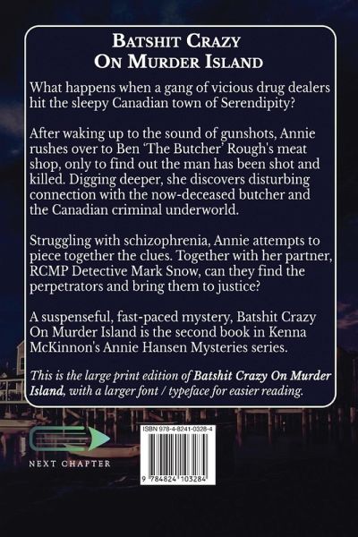What happens when a gang of vicious drug dealers hit the sleepy Canadian town of Serendipity? After waking up to the sound of gunshots, Annie rushes over to Ben 'The Butcher' Rough's meat shop, only to find out the man has been shot and killed. Digging deeper, she discovers disturbing connection with the now-deceased butcher and the Canadian criminal underworld. Struggling with schizophrenia, Annie attempts to piece together the clues. Together with her partner, RCMP Detective Mark Snow, can they find the perpetrators and bring them to justice? A suspenseful, fast-paced mystery, Batshit Crazy On Murder Island is the second book in Kenna McKinnon's Annie Hansen Mysteries series. This is the large print edition of Batshit Crazy On Murder Island, with a larger font / typeface for easier reading.