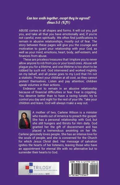Can two walk together, except they be agreed? Amos 3:3 (KJV) ABUSE comes in all shapes and forms. It will cut you, pull you, and take all that you have emotionally and, if you’re not careful, even spiritually. We often find justifications to remain in abusive relationships, mostly out of fear. The story between these pages will give you the courage and motivation to guard your relationship with your God, as well as your mind, emotions, heart, body, self-esteem, and finances from abuse. These are priceless treasures that I implore you to never allow anyone to rob from you or your loved ones. Abuse will plague you for a lifetime, and one lifetime is too short to be robbed by such evil. God intervened and worked mightily on my behalf, and all praise goes to my Lord that I’m not a statistic. Protect your children at all cost, as they cannot protect themselves. Listen and pay attention; children speak volumes in their actions. Endeavor not to remain in an abusive relationship because of financial difficulties or fear. Fear is crippling. You deserve better than to have a raving lunatic try to control you day and night for the rest of your life. Take your children and leave. God will always make a way out.