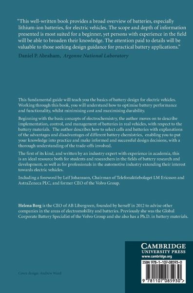 This is the first practical guide to optimizing battery usage in electric vehicles. Covering topics ranging from materials and electrochemistry to practical implementation and control, and with guidelines for battery and cell selection, this is an ideal resource for researchers in battery design and practitioners in the automotive industry.