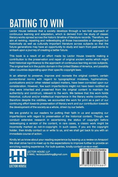 Batting To Win: A Story Of College Baseball This book is a result of an effort made by us towards making a contribution to the preservation and repair of original classic literature. In an attempt to preserve, improve and recreate the original content, we have worked towards: 1. Type-setting & Reformatting: The complete work has been re-designed via professional layout, formatting and type-setting tools to re-create the same edition with rich typography, graphics, high quality images, and table elements, giving our readers the feel of holding a 'fresh and newly' reprinted and/or revised edition, as opposed to other scanned & printed (Optical Character Recognition - OCR) reproductions. 2. Correction of imperfections: As the work was re-created from the scratch, therefore, it was vetted to rectify certain conventional norms with regard to typographical mistakes, hyphenations, punctuations, blurred images, missing content/pages, and/or other related subject matters, upon our consideration. Every attempt was made to rectify the imperfections related to omitted constructs in the original edition via other references. However, a few of such imperfections which could not be rectified due to intentional\unintentional omission of content in the original edition, were inherited and preserved from the original work to maintain the authenticity and construct, relevant to the work. We believe that this work holds historical, cultural and/or intellectual importance in the literary works community, therefore despite the oddities, we accounted the work for print as a part of our continuing effort towards preservation of literary work and our contribution towards the development of the society as a whole, driven by our beliefs. We are grateful to our readers for putting their faith in us and accepting our imperfections with regard to preservation of the historical content. HAPPY READING!