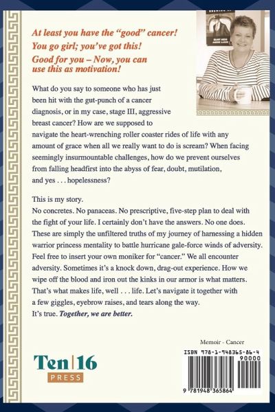 At least you have the "good" cancer! You go girl; you've got this! Good for you-Now, you can use this as motivation! What do you say to someone who has just been hit with the gut-punch of a cancer diagnosis, or in my case, stage III, aggressive breast cancer? How are we supposed to navigate the life-altering roller coaster rides of life with any amount of grace when all we really want to do is scream? When facing seemingly insurmountable challenges, how do we prevent ourselves from falling headfirst into the abyss of fear, doubt, mutilation, and yes . . . hopelessness? THIS IS MY STORY. No concretes. No panaceas. No prescriptive, five-step plan to deal with the fight of your life. I certainly don't have the answers. No one does. These are simply the unfiltered truths of my journey of harnessing a hidden warrior princess mentality to battle hurricane gale-force winds of adversity. Feel free to insert your own moniker for "cancer." We all encounter adversity. Sometimes it's a knock down, drag-out experience. How we wipe off the blood and iron out the kinks in our armor is what matters. That's what makes life, well . . . life. Let's navigate it together with a few giggles, eyebrow raises, and tears along the way. It's true. Together, we are better.