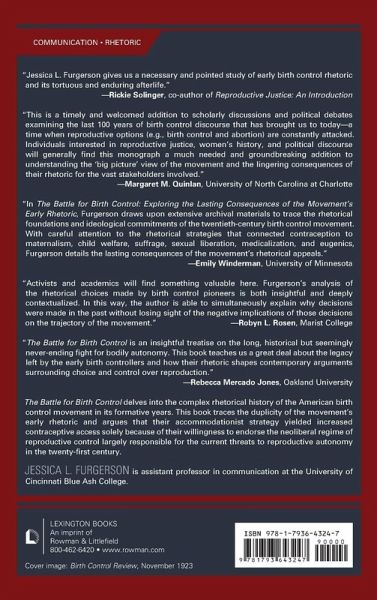 The Battle for Birth Control dissects the rhetorical tactics utilized by the movement in its formative years to execute a strategy of political accommodation and traces the reverberations of these tactics in contemporary American discourses surrounding contraception specifically and reproductive politics more generally.