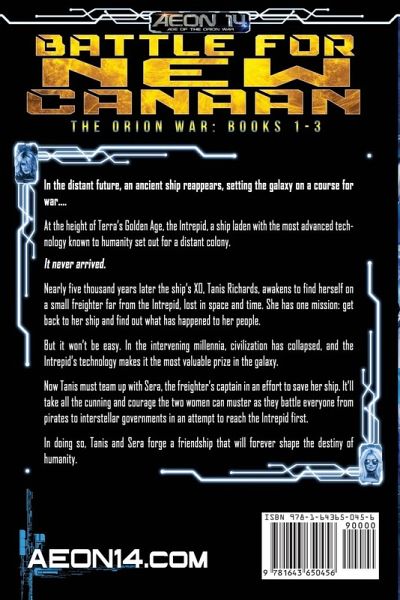 In the distant future an ancient ship reappears, setting the galaxy on a course for war. At the height of Terra's Golden Age, the Intrepid, a ship laden with the most advanced technology known to humanity set out for a distant colony. It never arrived. Nearly five thousand years later the ship's XO, Tanis Richards, awakens to find herself on a small freighter far from the Intrepid, lost in space and time. She has one mission: get back to her ship and find out what has happened to her people. But it won't be easy. In the intervening millennia, civilization has collapsed, and the Intrepid's technology makes it the most valuable prize in the galaxy. Now Tanis must team up with Sera, the freighter's captain in an effort to save her ship. It'll take all the cunning and courage the two women can muster as they battle everyone from pirates to interstellar governments in an attempt to reach the Intrepid first. In doing so, Tanis and Sera forge a friendship that will forever shape the destiny of humanity. Pick up Battle for New Canaan today and embark on one of the greatest Science Fiction tales ever written. This omnibus edition contains the following four books: Destiny Lost Set the Galaxy on Fire New Canaan Orion Rising