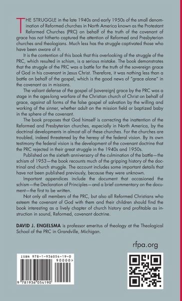 The Battle for Sovereign Grace in the Covenant recounts much of the gripping history of the schism of 1953 within the Protestant Reformed Churches (PRC), the culmination of the hard fought battle for sovereign grace in the covenant. The book includes new, important details that have not been previously published and also provides the history of the controversial adoption by the PRCA of the Declaration of Principles, the document that in some ways occasioned the schism of 1953. In the appendices of the book, Engelsma gives a brief, valuable commentary on the Declaration, the first commentary to be written.