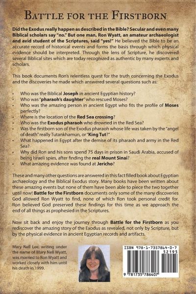 Did the Exodus really happen as described in the Bible? Secular and even many Biblical scholars say "no." But one man, Ron Wyatt, an amateur archaeologist and avid student of the Scriptures, said "yes!" He believed the Bible to be an accurate record of historical events and forms the basis through which physical evidence should be interpreted. Through the lens of Scripture, he discovered several Biblical sites which are today recognized as authentic by many experts and scholars. This book documents Ron's relentless quest for the truth concerning the Exodus and the discoveries he made which answered several questions such as: ¿ Who was the Biblical Joseph in ancient Egyptian history? ¿ Who was "pharaoh's daughter" who rescued Moses? ¿ Who was the amazing person in ancient Egypt who fits the profile of Moses perfectly? ¿ Where is the location of the Red Sea crossing? ¿ Who was the Exodus pharaoh who drowned in the Red Sea? ¿ Was the firstborn son of the Exodus pharaoh whose life was taken by the "angel of death" really Tutankhamun, or "King Tut?" ¿ What happened in Egypt after the demise of its pharaoh and army in the Red Sea? ¿ Why did Ron and his sons spend 75 days in prison in Saudi Arabia, accused of being Israeli spies, after finding the real Mount Sinai? ¿ What amazing evidence was found at Jericho? These and many other questions are answered in this fact filled book about Egyptian archaeology and the Biblical Exodus story. Many books have been written about these amazing events but none of them have been able to piece the two together until now! Battle for the Firstborn documents only some of the many discoveries God allowed Ron Wyatt to find, none of which Ron took personal credit for. Ron believed God preserved these findings for this time as we approach the end of all things as prophesied in the Scriptures.