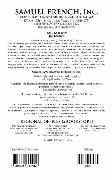 Characters: 4 male, 1 female with doubling Unit Set Winner! LA Weekly Award for Best New Play Award-winning playwright Jim Leonard's latest, Battle Hymn, is the story of 16-year-old Martha's epic pregnancy and her incredible search for motherhood, meaning, and love in a war-torn American landscape. After being abandoned by her father, losing her true love and witnessing the horrors of the Civil War firsthand, Martha settles on one incontrovertible fact: She