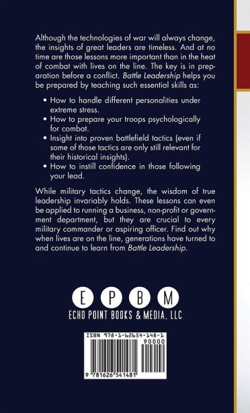 Although the technologies of war will always change, the insights of great leaders are timeless. And at no time are those lessons more important than in the heat of combat with lives on the line. The key is in preparation before a conflict. Battle Leadership helps you be prepared by teaching such essential skills as: How to handle different personalities under extreme stress. How to prepare your troops psychologically for combat. Insight into proven battlefield tactics (even if some of those tactics are only still relevant for their historical insights). How to instill confidence in those following you. While military tactics change, the wisdom of true leadership invariably holds. These lessons can even be applied to running a business, non-profit or government department, but they are crucial to every military commander or aspiring officer. Find out why when lives are on the line, generations have turned to and continue to learn from Battle Leadership.