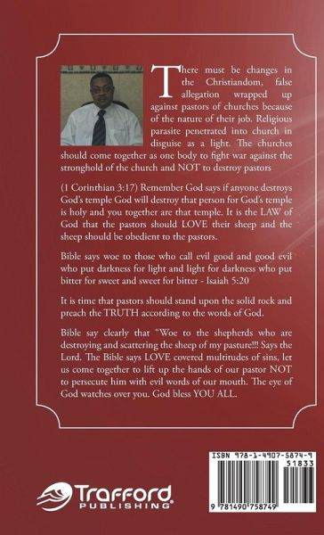 There must be changes in the Christiandom, false allegation wrapped up against pastors of churches because of the nature of their job. Religious parasite penetrated into church in disguise as a light. The churches should come together as one body to fight war against the stronghold of the church and NOT to destroy pastors (1 Corinthian 3:17) Remember God says if anyone distroys God's temple God will distroy that person for God's temple is holy and you together are that temple. It is the LAW of God that the pastors should LOVE their sheep and the sheep should be obedient to the pastors. Bible says woe to those who call evil good and good evil who put darkness for light and light for darkness who put bitter for sweet and sweet for bitter - Isaiah 5:20 It is time that pastors should stand upon the solid rock and preach the TRUTH according to the words of God. Bible say clearly that "Woe to the shepherds who are destroying and scattering the sheep of my pasture!!! Says the Lord. The Bible says LOVE covered multitudes of sins, let us come together to lift up the hands of our pastor NOT to persecute him with evil words of our mouth. The eye of God watches over you. God bless YOU ALL.