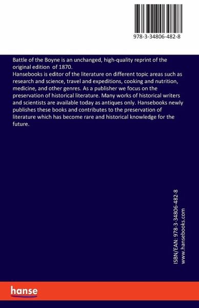 Battle of the Boyne is an unchanged, high-quality reprint of the original edition of 1870.Hansebooks is editor of the literature on different topic areas such as research and science, travel and expeditions, cooking and nutrition, medicine, and other genres. As a publisher we focus on the preservation of historical literature. Many works of historical writers and scientists are available today as antiques only. Hansebooks newly publishes these books and contributes to the preservation of literature which has become rare and historical knowledge for the future.