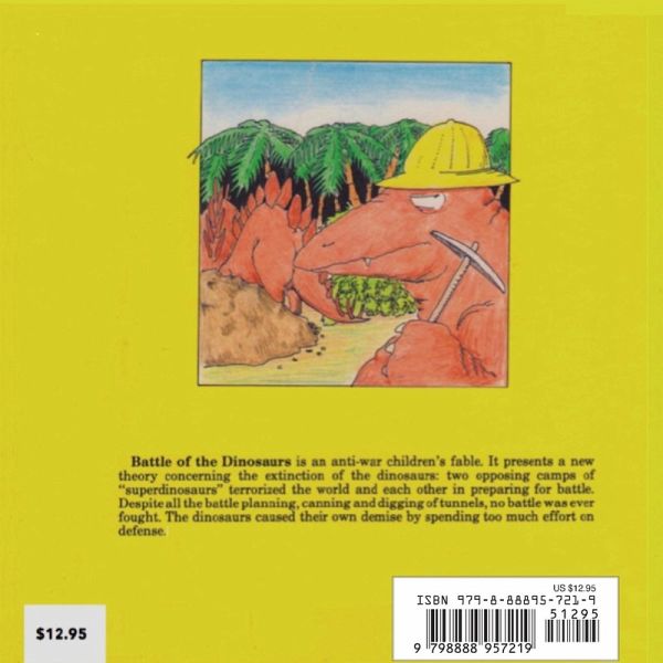 The Battle of the Dinosaurs is an anti-war children's fable. It presents a new theory concerning the extinction of the dinosaurs: tow opposing camps of "superdinosaurs" terrorized the world and each other in preparing for battle. Despite all of the planning, canning and digging of tunnels, no battle was ever fought. The dinosaurs caused their own demise by spending too much effort on defense.