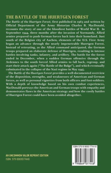 The Battle of the Huertgen Forest, first published in 1963 and written by Official Department of the Army Historian Charles B. MacDonald, recounts the story of one of the bloodiest battles of World War II. In September 1944, three months after the invasion of Normandy, Allied armies prepared to push German forces back into their homeland. Just south of the Belgian city of Aachen, elements of the U.S. First Army began an advance through the nearly impenetrable Huertgen Forest. Instead of retreating, as the Allied command anticipated, the German troops prepared an elaborate defense of Huertgen, resulting in intense battles involving tanks, infantry, and artillery. The battle for the forest ended in December, when a sudden German offensive through the Ardennes to the south forced Allied armies to fall back, regroup, and start their attack again ("The Battle of the Bulge"), and which eventually culminated in the collapse of the Nazi regime in May 1945. The Battle of the Huertgen Forest provides a well-documented overview of the disposition, strengths, and weaknesses of American and German forces, as well as personal vignettes from both officers and foot-soldiers. With a depth of knowledge based on his own combat experiences, MacDonald portrays the American and German troops with empathy and demonstrates flaws in the American strategy and how the costly battles of Huertgen Forest could have been avoided altogether. This complete, unabridged edition includes maps and an index.