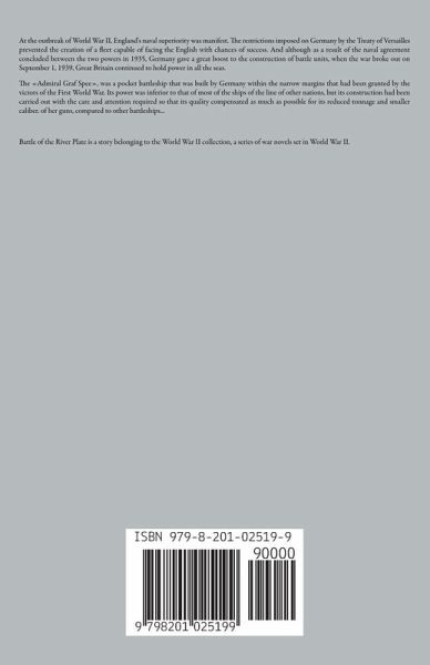 At the outbreak of World War II, England's naval superiority was manifest. The restrictions imposed on Germany by the Treaty of Versailles prevented the creation of a fleet capable of facing the English with chances of success. And although as a result of the naval agreement concluded between the two powers in 1935, Germany gave a great boost to the construction of battle units, when the war broke out on September 1, 1939, Great Britain continued to hold power in all the seas. The «Admiral Graf Spee», was a pocket battleship that was built by Germany within the narrow margins that had been granted by the victors of the First World War. Its power was inferior to that of most of the ships of the line of other nations, but its construction had been carried out with the care and attention required so that its quality compensated as much as possible for its reduced tonnage and smaller caliber. of her guns, compared to other battleships... Battle of the River Plate is a story belonging to the World War II collection, a series of war novels set in World War II.