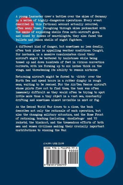 A young Lancaster crew’s battles over the skies of Germany in a series of highly-dangerous operations. Every event described in this fictional account actually occurred, often many times. Ploughing through skies pockmarked with the smoke of exploding shells from anti-aircraft guns, and coned by dozens of searchlights, they also faced the bullets and canon shells of night fighters. A different kind of danger, but sometimes no less deadly, often took place in appalling weather conditions. Caught, for instance, in a massive cumulonimbus cloud their aircraft might be battered by hailstones while being tossed up and down hundreds of feet in vicious convection currents, with ice forming up to six inches thick on the wings, and threatening its ability to remain airborne.