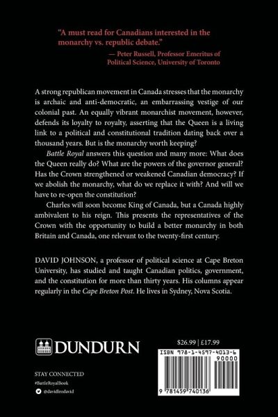 What is the future of the monarchy in Canada? A strong republican movement in Canada stresses that the monarchy is archaic and anti-democratic, an embarrassing vestige of our colonial past. An equally vibrant monarchist movement, however, defends its loyalty to royalty, asserting that the Queen is a living link to a political and constitutional tradition dating back over a thousand years. But is the monarchy worth keeping? Battle Royal answers this question and many more: What does the Queen really do? What are the powers of the governor general? Has the Crown strengthened or weakened Canadian democracy? If we abolish the monarchy, what do we replace it with? And will we have to re-open the constitution? Charles will soon become King of Canada, but a Canada highly ambivalent to his reign. This presents the representatives of the Crown with the opportunity to build a better monarchy in both Britain and Canada, one relevant to the twenty-first century.
