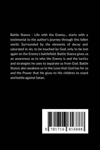 Battle Stance - Life with the Enemy... starts with a testimonial to the author's journey through this fallen world. Surrounded by the elements of decay and saturated in sin, to be touched by God, only to be lost again on the Enemy's battlefield. Battle Stance gives us an awareness as to who the Enemy is and the tactics and strategies he uses to separate us from God. Battle Stance also awakens us to the Love that God has for us and the Power that He gives to His children to stand and battle against Satan.