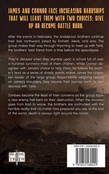 James and Connor face increasing hardships that will leave them with two choices: give up or become battle born! After the events in Nebraska, the Andderson brothers continue their trek northward, joined by Emmett, Alexis, and Ana. The group makes their way through Wyoming to meet up with Tank, the brothers' best friend from a time before the apocalypse. They're delayed when they stumble upon a school full of over a hundred survivors-most of them children. While Connor disagrees with James's choice to help them, he follows his brother's lead as a series of drastic events makes James the unspoken leader of the large group. Responsibility weighing heavily on James's shoulders, they resume their journey north to rendezvous with Tank. Zombies become the least of their concerns as the group faces a new enemy hell-bent on their destruction. When the situation goes from bad to worse, the brothers are confronted with the horrible reality that no matter how prepared you are, at the end of the world, death is always right around the corner.