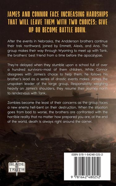 James and Connor face increasing hardships that will leave them with two choices: give up or become battle born! After the events in Nebraska, the Andderson brothers continue their trek northward, joined by Emmett, Alexis, and Ana. The group makes their way through Wyoming to meet up with Tank, the brothers' best friend from a time before the apocalypse. They're delayed when they stumble upon a school full of over a hundred survivors-most of them children. While Connor disagrees with James's choice to help them, he follows his brother's lead as a series of drastic events makes James the unspoken leader of the large group. Responsibility weighing heavily on James's shoulders, they resume their journey north to rendezvous with Tank. Zombies become the least of their concerns as the group faces a new enemy hell-bent on their destruction. When the situation goes from bad to worse, the brothers are confronted with the horrible reality that no matter how prepared you are, at the end of the world, death is always right around the corner.