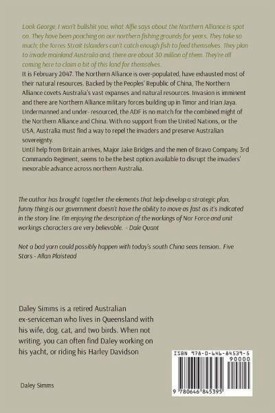 Look George, I won't bullshit you, what Alfie says about the Northern Alliance is spot on. They have been poaching on our northern fishing grounds for years. They take so much; the Torres Strait Islanders can't catch enough fish to feed themselves. They plan to invade mainland Australia and, there are about 30 million of them. They're all coming here to claim a bit of this land for themselves. It is February 2047. The Northern Alliance is over-populated, have exhausted most of their natural resources. Backed by the Peoples' Republic of China, The Northern Alliance covets Australia's vast expanses and natural resources. Invasion is imminent and there are Northern Alliance military forces building up in Timor and Irian Jaya. Undermanned and under- resourced, the ADF is no match for the combined might of the Northern Alliance and China. With no support from the United Nations, or the USA, Australia must find a way to repel the invaders and preserve Australian sovereignty. Until help from Britain arrives, Major Jake Bridges and the men of Bravo Company, 3rd Commando Regiment, seems to be the best option available to disrupt the invaders' inexorable advance across northern Australia.